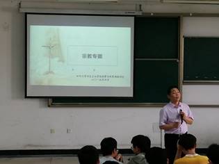讲授过程中,陈笃海副书记根据自己的看法,谈到“巫术是宗教的起源,人是有限的,对无限的无力感,恐惧感使人敬畏、顺从、依赖宗教”,并详细地讲解了何为信仰自由,不仅是信仰宗教的自由,也有不信仰宗教的自由。老师简要介绍了我国的宗教政策,并提醒同学们:在我国,信仰宗教是自由的,但是在公司里不允许有任何的传教授教的活动。