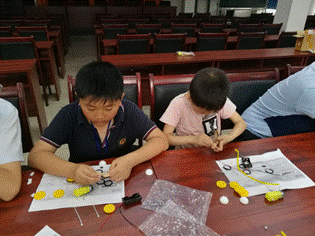 志愿者们在早上八点五十分于江安校区东门集合,一起坐车前往新街社区。志愿者们到达活动室时小朋友们已经乖乖地坐在了自己的座位上。紧接着,志愿者开始分发材料,小朋友们欣喜不已。小朋友们先按照图纸自己研究,遇到不懂的问题时身旁的志愿者们会提供帮助。这样更有利于锻炼小朋友们的动脑与动手能力。第一个完成的小朋友开心地举起了自己的电动小爬虫,时间过去没多久,其他小朋友们也陆续完成了自己的作品。每个小朋友都扬起嘴角,心中满满的成就感,志愿者们望着孩子们,也十分开心。
