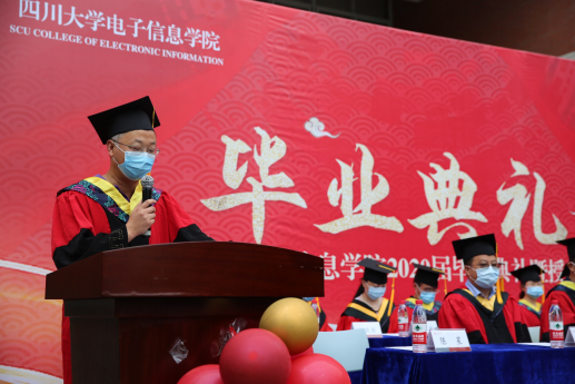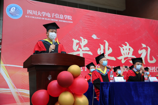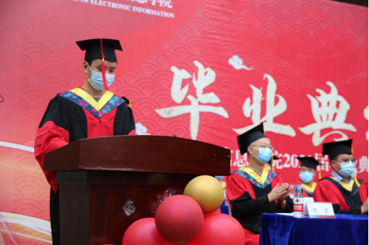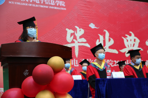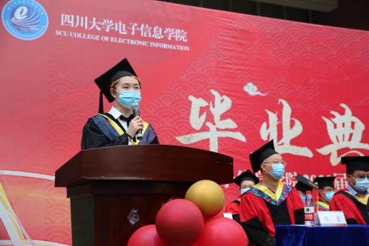 郭轩君同学代表2020届本科毕业生发言,疫情当下,相隔半年在此相聚,迎来了期盼已久的毕业典礼,她围绕了“难忘”、“感激”、“再见”三个词言简意赅地表达了自己的心声,难忘校园的一草一木,感激母校及恩师,再见川大的一切,一日电子人,一生望江情,最后她代表全体本科毕业生对母校和太阳网集团tcy8722送出了诚挚的祝福。