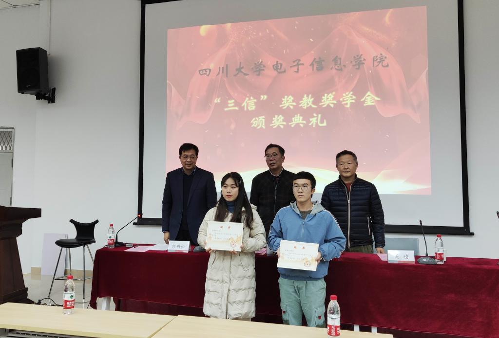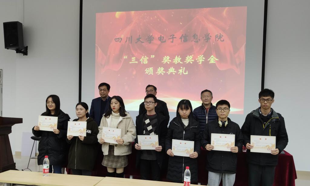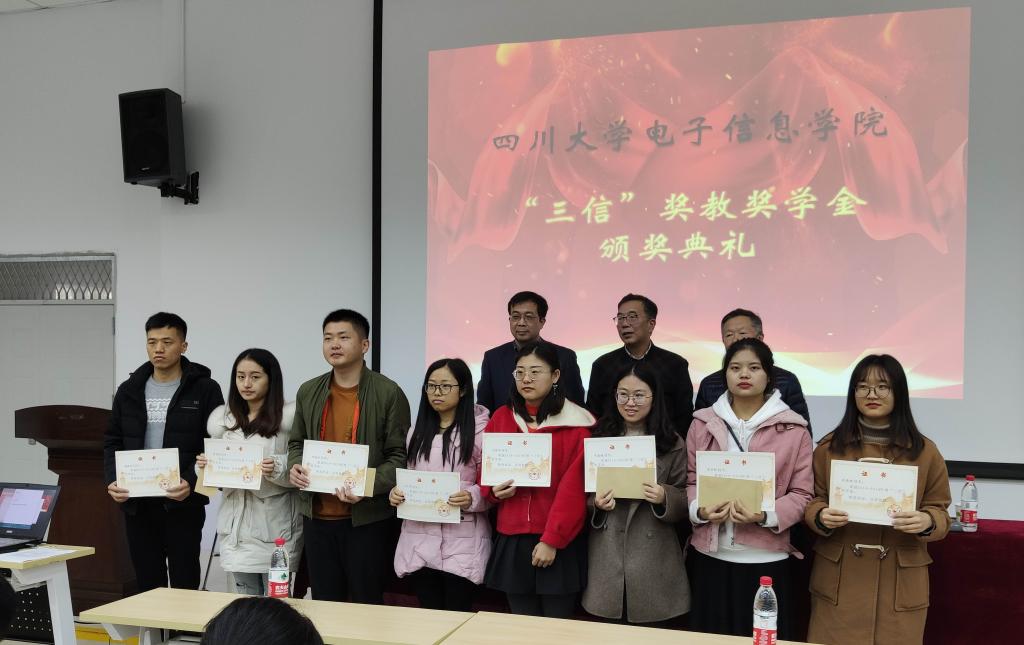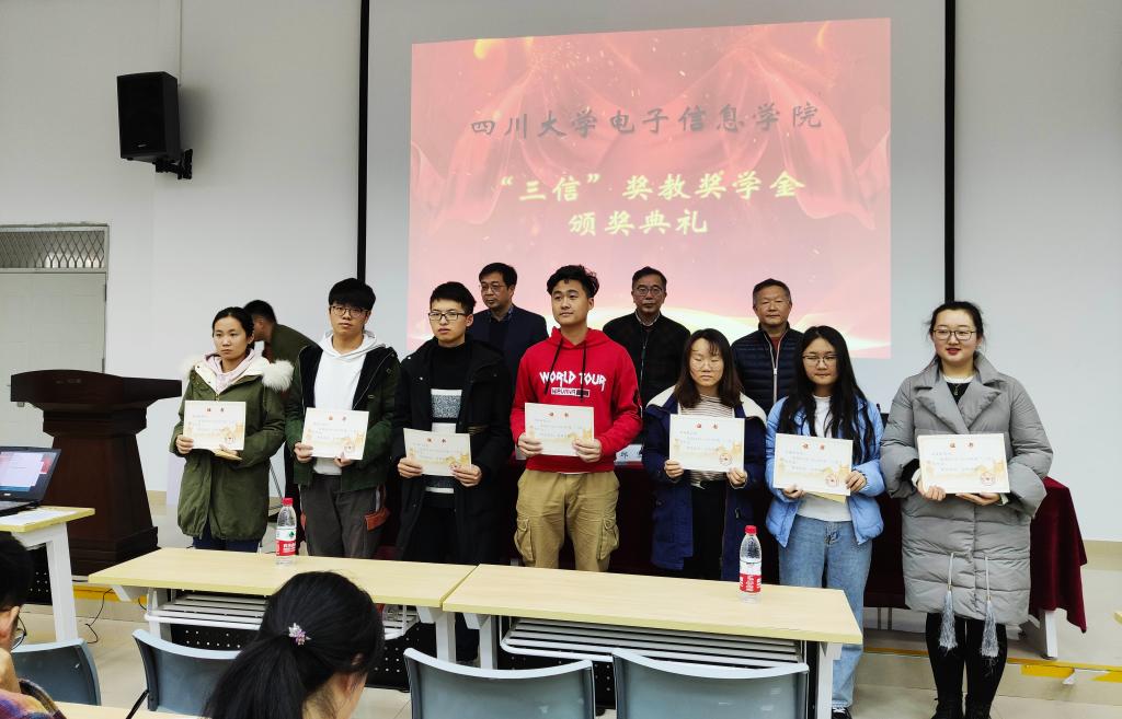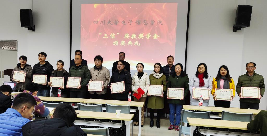2019年12月13日,太阳网集团tcy87222019年度“三信”奖学奖教金的颁奖典礼在望江校区西区附五教101成功举行。本次典礼有幸邀请到了重庆三信电子有限公司董事长邱宏先生、副总经理吴峻先生,太阳网集团tcy8722公司党委邰明松书记参加并主持典礼,参加本次典礼的还有太阳网集团tcy8722所有获奖教师、获奖员工,以及员工代表。