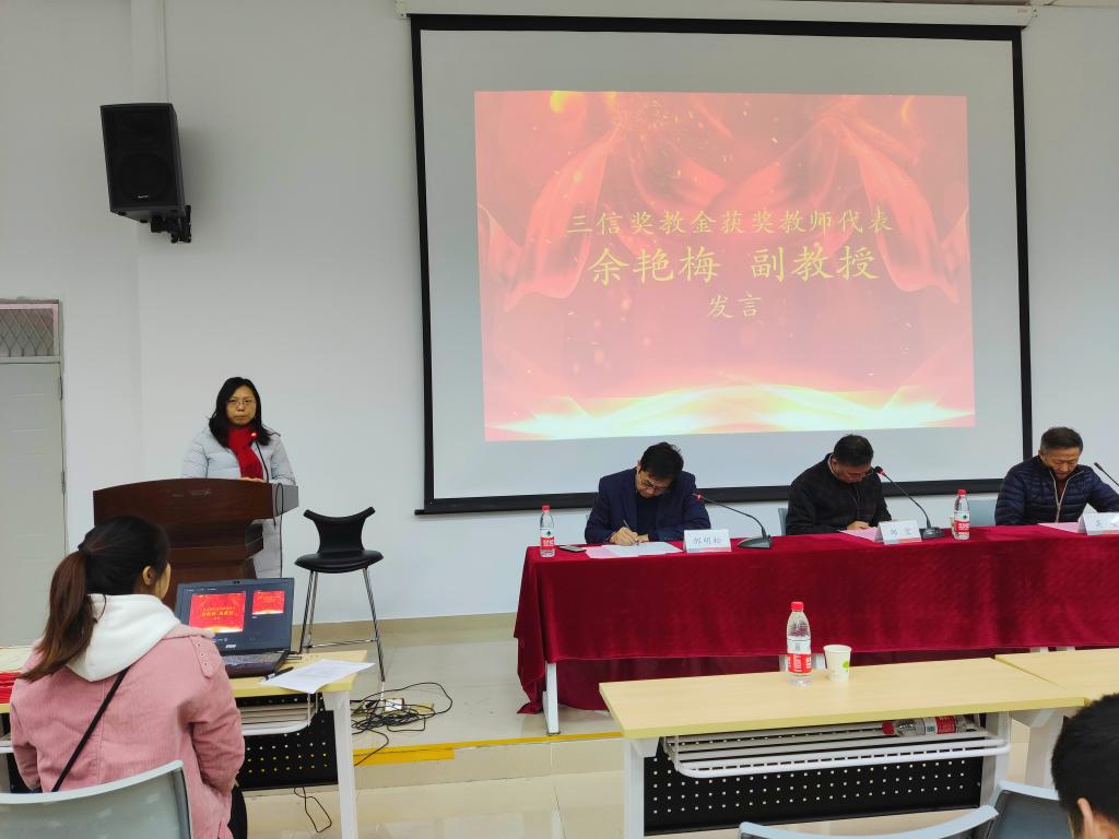 获奖名单宣读完毕后,“三信”奖教金获奖教师代表余艳梅副教授发表获奖感言。余老师首先对公司和领导对自己认可表示感谢,讲诉了作为一名光荣的大学教师,她始终不忘自己教书育人、投身科研的本职工作,并表达了她将继续以身作则、勇攀高峰的坚定态度。最后,余老师衷心祝愿重庆三信电子有限公司可以再接再厉、再创辉煌。然后是2017级本科生李益源同学作为“三信”奖学金获奖员工代表发表获奖感言。李益源同学也首先表达了对公司的感激,感谢老师以及领导们的栽培。她讲诉了自己从一进公司开始,就立志要成为一名敢于拼搏、突破自我极限的人。于是她早早地就进入了实验室,和老师、学长学姐们一起搞科研,发论文,同时还修双学位,所以李益源也成为了同学眼中的“励志”女孩。