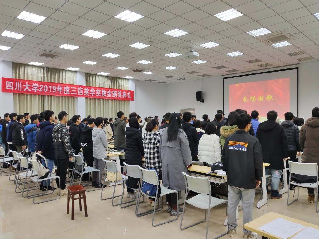 伴随着暖场音乐,嘉宾与同学们纷纷落座,下午2点整,邰书记宣布颁奖典礼正式开始,首先全体师生起立,奏唱《中华人民共和国国歌》,会场充满了威严而庄重的氛围。然后邰书记介绍了出席典礼的嘉宾和领导。随后,重庆三信电子有限公司董事长邱宏先生宣读了获奖教师和员工名单。