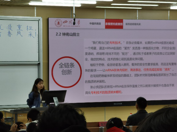 活动开始奏响共青团团歌,主持人带领团员庄严宣誓。主讲人朱婧老师就共青团光荣历史、中国共青团性质、中国共青团标致、共青团员的义务和权利、团支部工作、团组织生活会等问题进行了详细的阐述,对在抗击新冠疫情中为祖国做出突出贡献的陈薇院士和钟南山院士的抗疫成果做出详细的介绍并对共青团推优入党、推优具体条件和如何争做一名合格的老员工团员等问题进行了答疑。