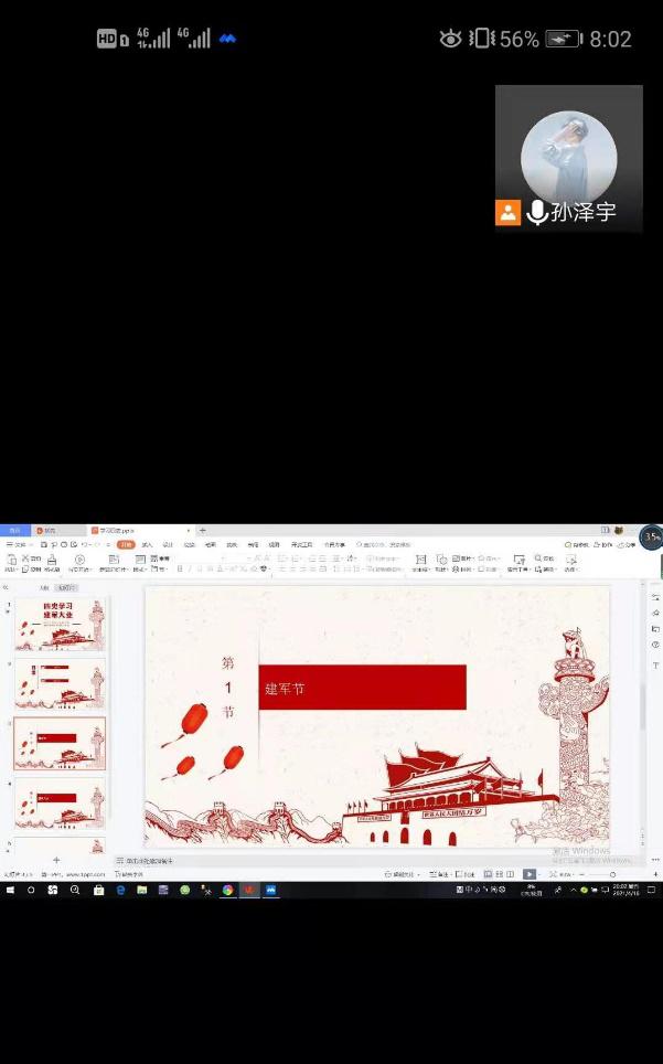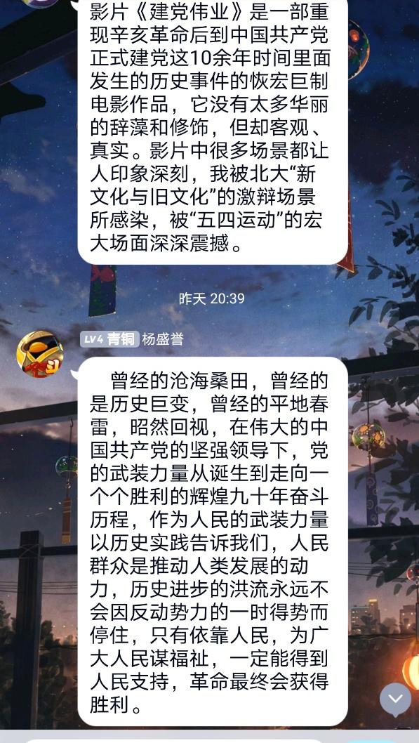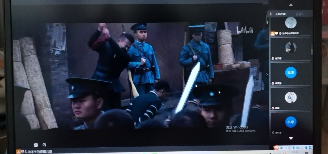 本次活动以建军节为主题,带领同学们回顾历史,让同学们学习了解建军节的历史背景,并以此为基础,深刻发掘其内涵,让同学们关注时事,一定程度上保证了活动的参与度。本次活动由团支书孙泽宇主持,首先是班长宋慧琳同学进行了关于建军节的演讲,然后播放了电影《建军大业》,最后所有参会同学在QQ群里发表了自己的感想。此次活动前期准备充分,形式新颖。