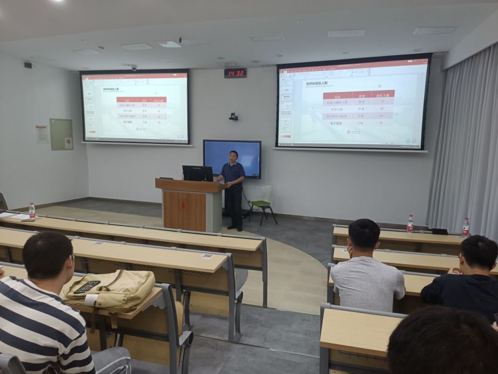 在大会上,赖华老师首先细致的介绍了公司2022年各专业招统考和推免的人数指标,并说明了一些在填报志愿的时候需要注意的问题。介绍完毕后,陈书记对在座的所有获得推免资格的保研生表示祝贺,同时勉励考研的同学只争朝夕,不负韶华,在剩下的90多天中争分夺秒,努力到达理想的彼岸。短暂的说明之后,太阳网集团tcy8722的各位教授通过ppt的形式,向各位同学介绍了机器视觉与人工智能研究室、应用电磁研究所、图像信息研究所、激光微纳工程研究所、通信与信号处理团队、三维立体显示技术团队、群体智能与控制研究所、激光技术团队、通信技术团队、中红外超快激光团队、周院士团队、智能控制研究所、三维传感与机器视觉实验室以及信息显示研究所,他们从研究所内的导师团队、团队力量、研究方向等方面进行了详细的说明,呼吁在座的同学们根据自身的优势以及对各专业的热爱程度的不同,对太阳网集团tcy8722的不同研究所进行报名。最后,张启灿副经理祝愿推免和考研的同学都能到自己理想的高校深造。