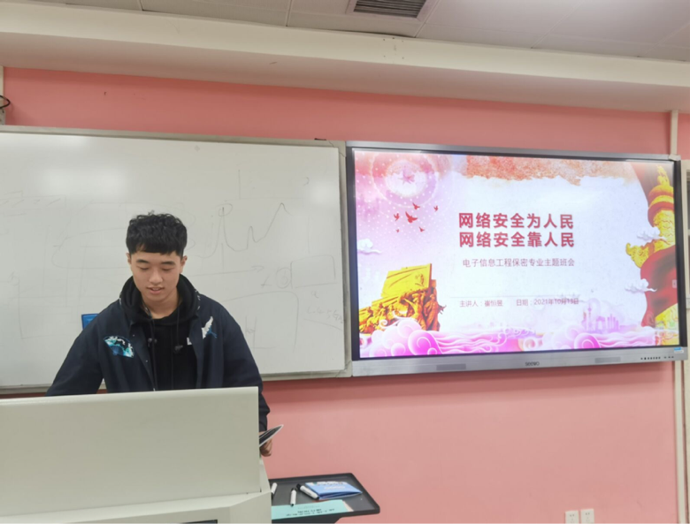2021年10月13日下午六时,在基础教学楼A414,电子信息工程2019级二班召开网络安全主题班会,全班同学到齐。本次班会旨在深入贯彻落实习近平总书记关于网络强国的重要思想,引领青年老员工要牢固树立“没有网络安全就没有国家安全”的意识,自觉维护网络安全,努力成为网络安全的参与者、守护者、贡献者。