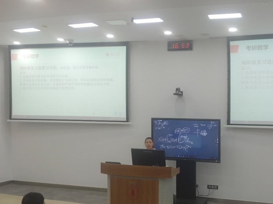 紧接着,金雨霜同学也分享了自己对于数学、政治、英语这三门考研科目的心得。她重点强调同学们对于考研要有很好的时间规划。把不同阶段该做的事情都理清楚,同时鼓励同学们按考研各科考试的时间来进行针对性的学习。