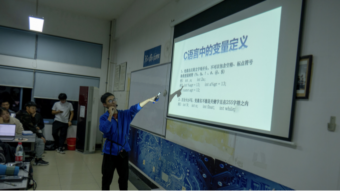 16:20,授课准时开始。首先,技术部干部庄毅同学细致地对上节课的知识进行了复习,并与同学们进行了互动。然后,根据同学们对C语言的了解情况,技术部干部曹子健同学对C语言知识进行了一定的介绍。接下来,曹子健同学为大家讲解了如何点亮一个LED灯,并让同学们了解了如何制作流水灯、走马灯及如何用按键控制灯的亮灭。最后,技术部各位干部耐心地为同学们解答疑惑并了解了大家的学习情况。至此,电子科技园技术部第二次授课圆满结束。