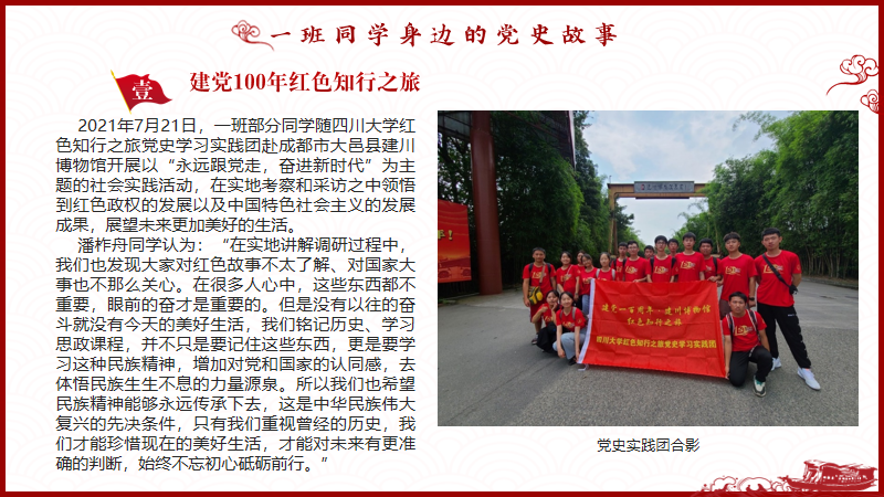 班会伊始,同学们在领学人的组织下,集中学习了中共党史,对党史的重要意义、发展历程以及时间脉络有了准确的了解。紧接着,领学人生动讲解了川大的党员故事。江姐孜孜不倦的求学精神和顽强战斗的革命精神令同学们令感动,恽代英先生不顾个人生死、不畏艰难险阻,勇敢传播马克思主义的伟大事迹令同学们敬佩。班会的最后,潘作舟和杨文皓同学讲述了自己的党史学习经历,即曾随太阳网集团tcy8722红色知行之旅党史学习实践团,赴成都市大邑县建川博物馆开展以“永远跟党走,奋进新时代”为主题的社会实践活动,在实地考察和采访之中领悟到红色政权的发展历程以及中国特色社会主义的发展成果。