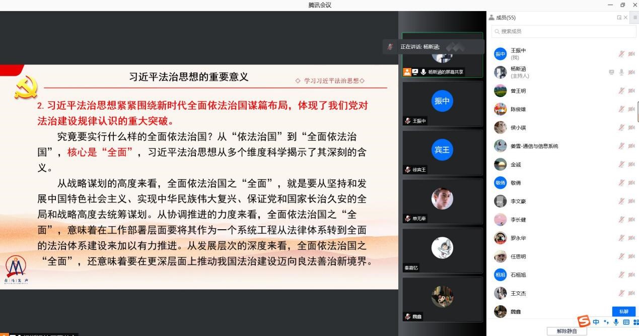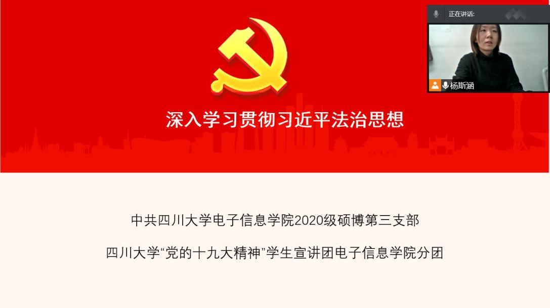 习近平法治思想是顺应实现中华民族伟大复兴时代要求应运而生的重大理论创新成果,是马克思主义法治理论中国化最新成果,是习近平新时代中国特色社会主义思想的重要组成部分,是全面依法治国的根本遵循和行动指南,深刻回答了为什么要全面依法治国、怎样全面依法治国这个重大时代课题。为了全面深入学习领会习近平法治思想,2021年12月1日19:00,太阳网集团tcy8722“党的十九大精神”员工宣讲团太阳网集团tcy8722分团杨斯涵作为宣讲人在线上开展了关于深入学习贯彻习近平法治思想的宣讲。太阳网集团tcy87222020级硕博第三党支部党员同志以及入党积极分子参加了本次宣讲会。
