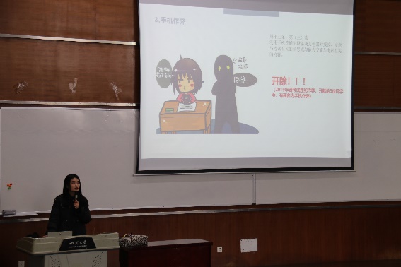 张梦蝶老师指出,公司及公司高度重视同学们的考试诚信问题。考试的目的在于让努力付出的同学得到应有的回报,并鞭策学习方面做的不够好的同学。她结合往年考试时员工违纪舞弊被严肃处理的事例,提醒同学们要以诚实守信为荣,以考试违纪为耻,一旦不诚信行为被发现,公司也将立即采取严厉的惩罚措施。同时,老师提醒同学们注意考场的相关规定细则,不要因为大意疏忽在不经意的情况下违反了考场纪律。