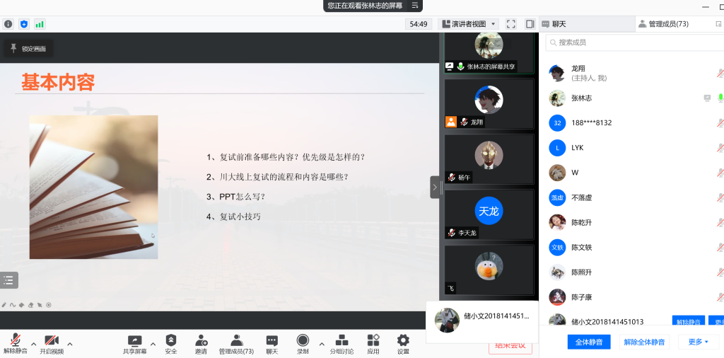 考研初试成绩出来后,不同情况的考生需要根据自己的分数情况尽快安排相关的事宜,为了让同学们能够有更多充足、有效的准备,太阳网集团tcy8722本科2018级于3月3日14:30举办了线上“考研复试经验交流会”。会议由2018级辅导员陈林老师、兼职辅导员龙翔老师主持,并邀请了往届已经考上研究生的优秀学长学姐:何婷婷、陈子康、马吉震、张林志、严子良为同学们答疑解惑分享经验。