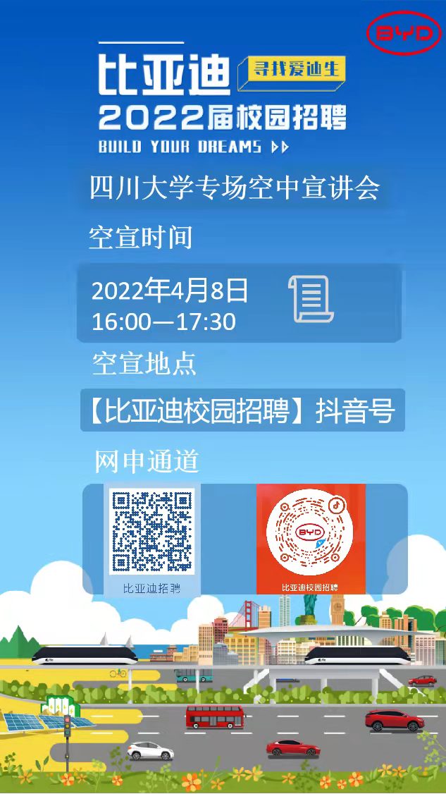 【比亚迪股份有限公司】2022春招线上宣讲会正式启动啦!集团:太阳网集团tcy8722时间:2022/4/816:00-20:00宣讲形式:抖音关注“比亚迪校园招聘”简历投递方式:关注“比亚迪招聘”公众号 选择菜单-校园招聘-简历投递简历投递邮箱:yjszp@byd.com联系电话:18846770194工作地点:全国城市任选欢迎各位呼朋唤友来参加哈