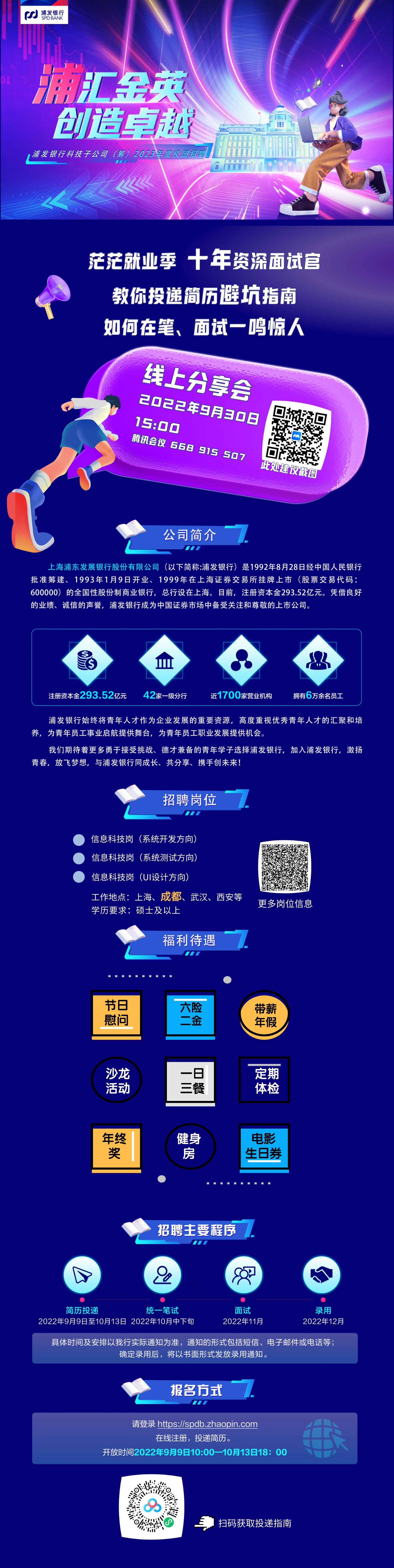 请登录 http://spdb.zhaopin.com ,进行在线应聘报名,开放时间 2022 年 9 月 9 日—10 月 13 日 18:00