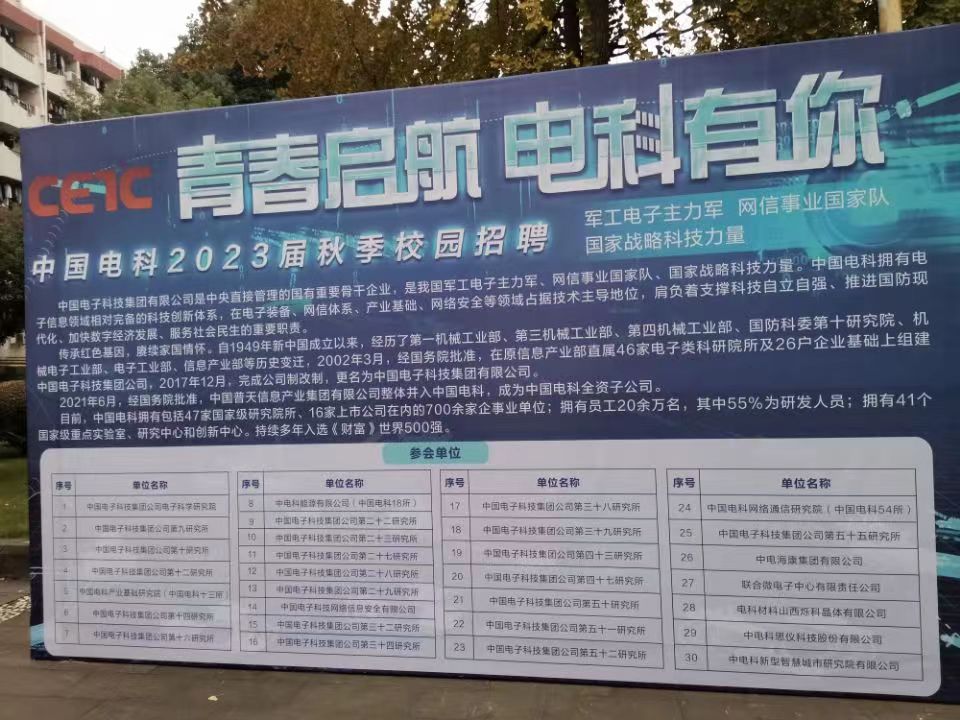 中国电子科技集团校园招聘会,由于公司那天静默所以没有到现场招聘,所以请同学们赶快电话联系后投递简历,链接里面有各个单位详细信息,请抓住机会,