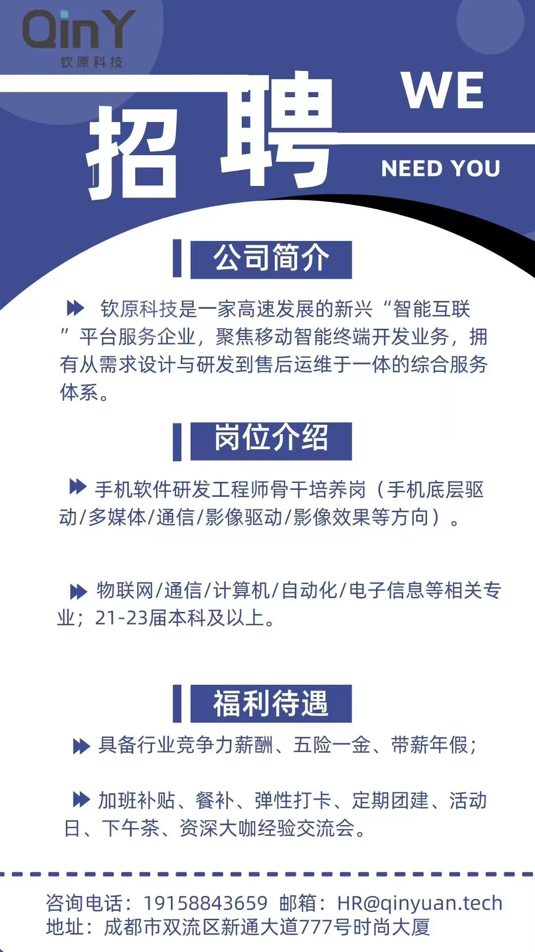 钦原科技有限公司(简称“钦原科技”)成立于2020年12月,总部坐落在“天府之国”成都,在西安、杭州、深圳设立有分公司或研发中心,现有员工1000余人。作为一家新兴”智能互联“的平台服务型企业,公司专注于为全球科技品牌客户提供端对端的生态合作与技术服务,聚焦智能终端的芯片、硬件、操作系统、应用软件四大核心业务的解决方案,拥有需求设计、产品开发、测试验收及售后运维护于一体的综合服务体系;目前主要业务涵盖移动端设备软硬件研发、影像应用研发、手机软件开发、相关产品的测试、各大电商平台的在线客服与直播带货。