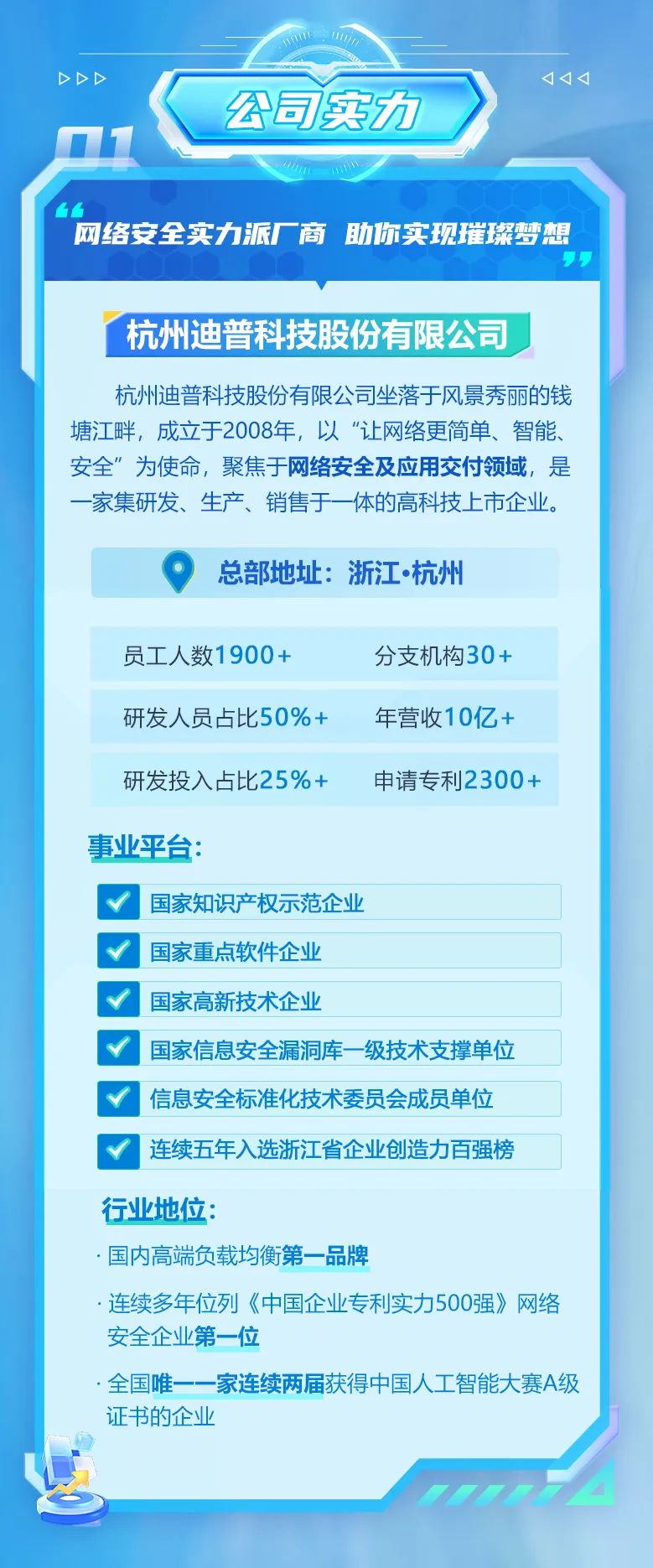 📣 关于我们:迪普科技是浙江省第一家上市的网络安全公司。创始人郑树生先生,曾任职华为常务副总裁(华为第一个博士)、新华三总裁,后创立迪普科技。迪