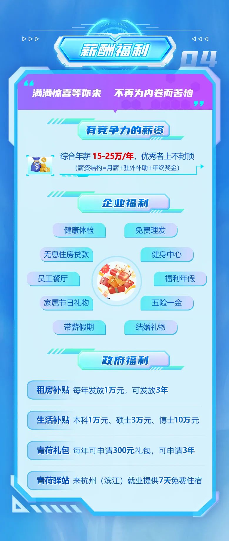 💰 薪资福利:综合薪资15-25W,优秀者薪资上不封顶!入职可享杭州市政府4-6万元补贴,无息住房贷款、股权激励、员工食堂、免费停车等更多福利等您来揭秘