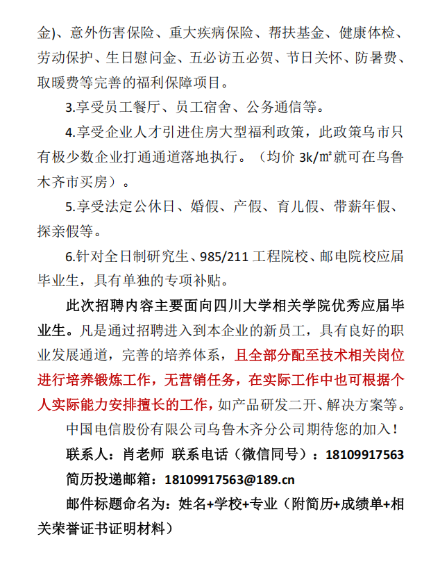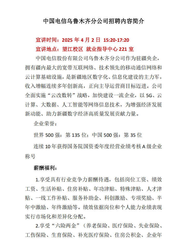 4月2日 15:20 就业中心221 中国电信乌鲁木齐分公司招聘