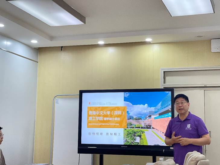 首先,方奕森主任作主题招生宣讲报告,他从历史传承、办学方式、人才培养体系、团队建设成果及招生政策五个维度,全方位展现了香港中文大学(深圳)的办学理念与学科实力,并特别强调了公司培养员工注重创新,面向国际的培养理念。作为一所立足香港,面向世界的国际化一流大学,香港中文大学(深圳)与香港本部秉持一所公司,两个校区,以相同的人才聘请要求,相同的员工培养要求,相同的办学资源与办学指导,共同建设好深圳校区。香港中文大学(深圳)理工公司广纳人才,有4位中国两院院士,10余位IEEE会士,教授们全职入职,全身心投入港中深的教学与科研工作中。香港中文大学(深圳)理工公司的专业设置丰富,团队力量强大,经费设施充足,就业范围广阔,是同学们未来深造的理想选择。