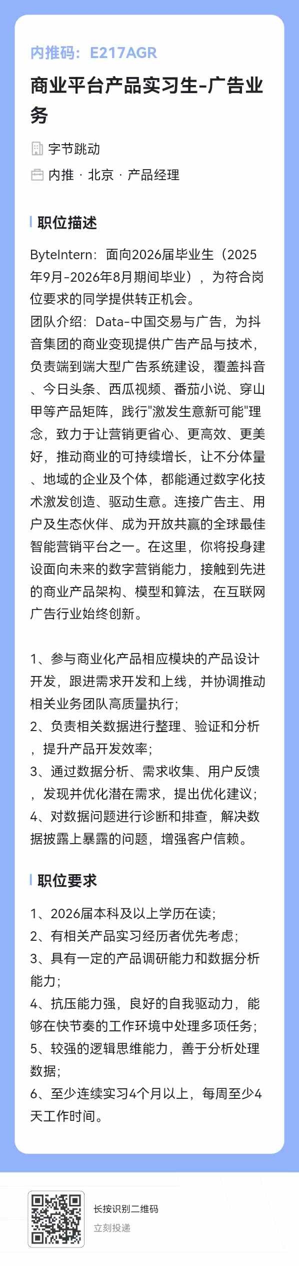 在字节的公司2018级硕士王员工(微信wy731505024)发消息,招26年毕业的校招生、实习生(可转正),以及社招商业平台产品经理,有看机会的同学或朋友欢迎推荐