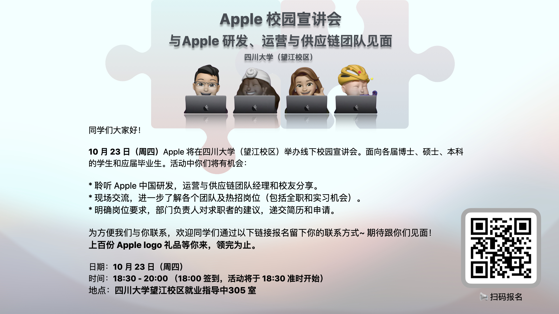 10月23日18:30在就业中心305Apple校园宣讲会