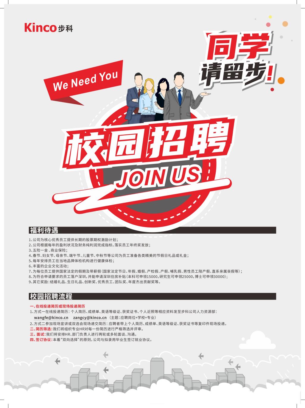 在线投递简历:个人简历、成绩单、英语等级证、获奖证书、个人近照等相应资料发至步科公司人力资源部:wangfe@kinco.cn、zangcy@kinco.cn(主题:应聘岗位+集团+专业)