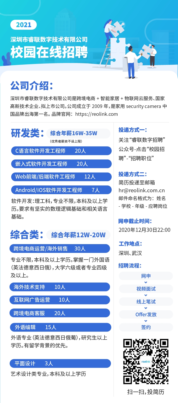 方式三:简历投递至hr@reolink.com.cn邮箱,命名格式为:姓名-公司-年级-应聘岗位。