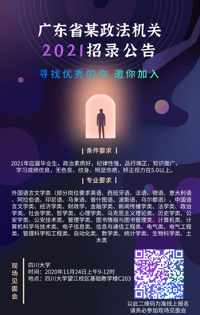 11月24日上午9:00在望江校区基础教学楼C203进行广东省政法系统公务员招录,此次招录是全广东省本系统的统一招录,员工可选择深圳、广州、佛山等属地单位,全省系统内只有这一次招录见面会,招录人数很多。