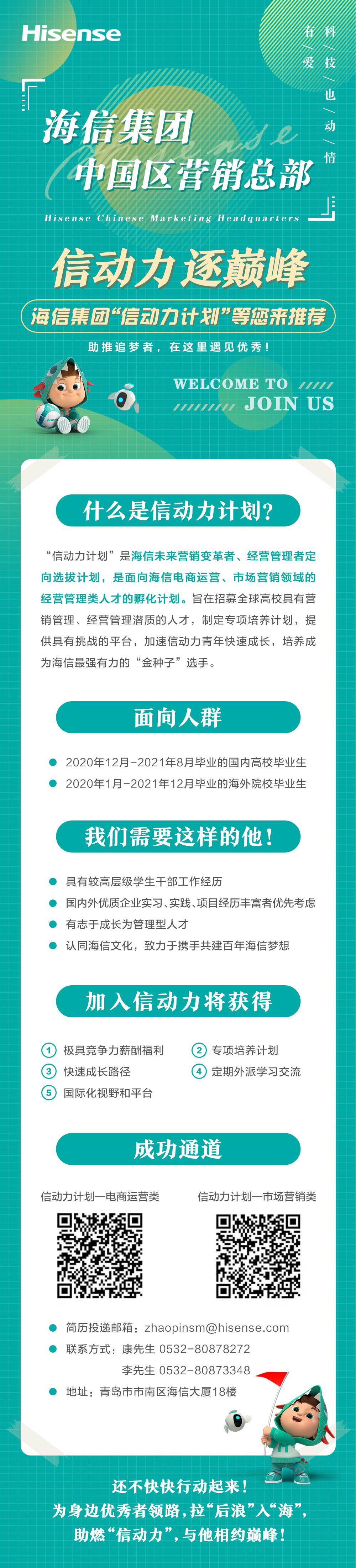 春招岗位营销、管理、技术各类岗位均有需求; <信动力计划>是海信今年推出的高端校园招聘项目,希望领导们能够定向推荐优秀的员工干部或者已经签约国内外优质企业的同学;不局限于是否已经签约的同学,只要想到海信,我们都可以进行深入交流;待遇在20-30万左右,这个计划旨在招募海信未来的管理干部。
