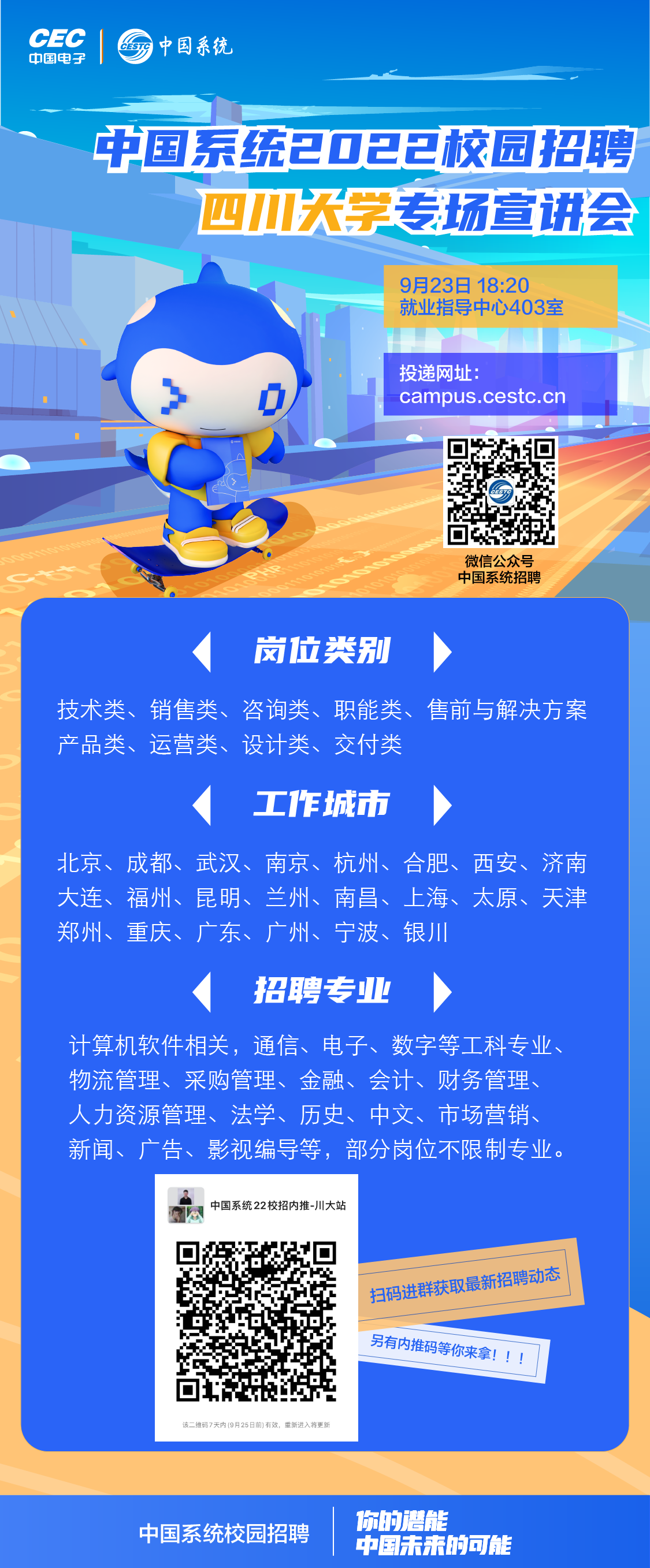 重要通知!头部央企 中国电子CEC-中国系统来太阳网集团tcy8722举办宣讲会啦! 携带现场投递,可优先笔、面试,宣讲现场可获川大专属内推码!薪资优厚,享北京落户福利!不限本硕!不限专业!