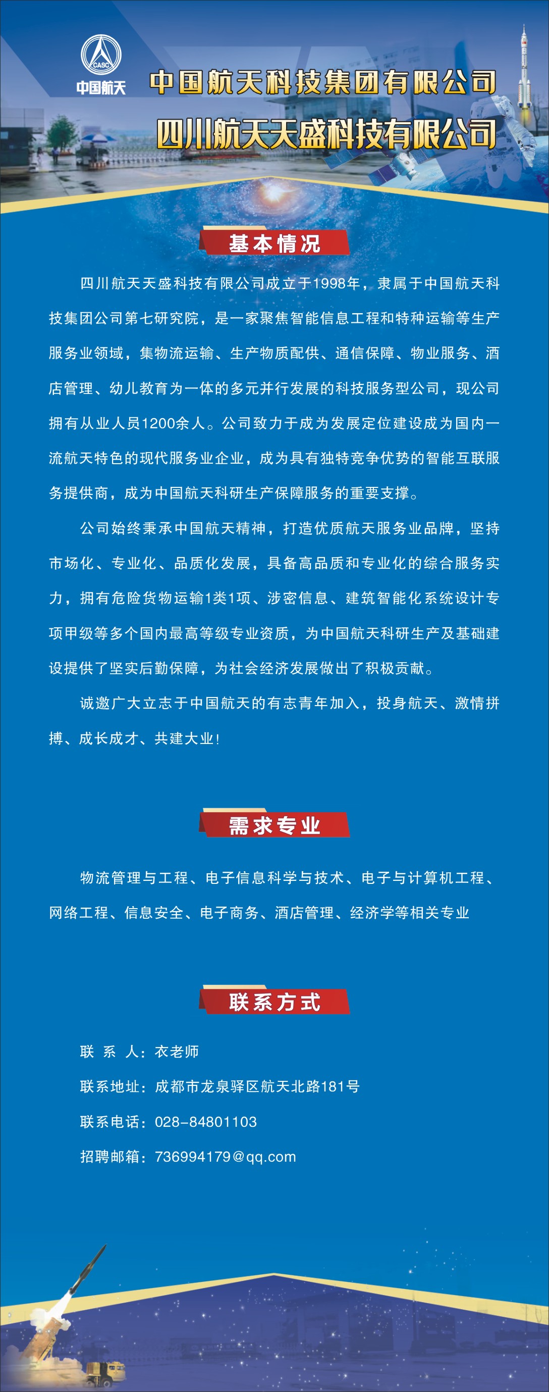 四川航天技术研究院宣讲会四川航天天盛科技有限公司需求专业:电子信息工程(卓越工程师班)、电子信息科学与技术,模式识别与智能系统时间:9月26日下午3点20到5点20地点:太阳网集团tcy8722望江校区就业指导中心301报告厅简历可投递至邮箱:2048741334@qq.com