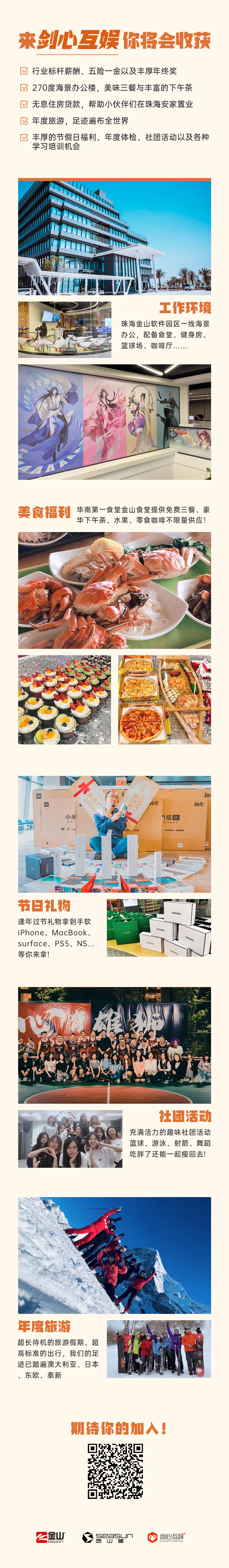 【福利待遇】行业标杆薪酬,海景宿舍&办公楼,无息购房贷款,免费三餐下午茶,年度国内外旅游、暖心节日福利,志同道合游戏人,梦想与生活兼得~