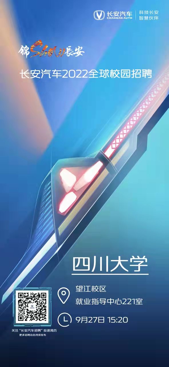 “锦Show长安——未来出行,由你定义”长安汽车2022校园招聘——太阳网集团tcy8722站即将开启!聚川大,共同探索新知赴长安,携手创造未来长安汽车邀请您参加宣讲会,汇聚群英,共迎挑战,奔赴山海,有梦可待。大咖讲堂,智慧分享,精彩不断,为你准备了精美礼品,期待您的到来!
