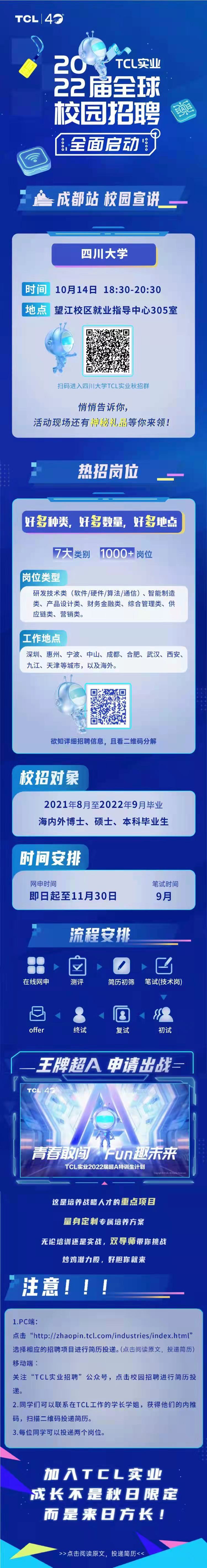 TCL实业 x 太阳网集团tcy8722 线下宣讲来啦!现场礼品丰厚等你来拿❗TCL智能手机钻石工艺美妆镜极简美学运动耳机 更有TCL实业 + 岗位需求等你 在这里,你想要的都有💯 『160+国家/地区』的国际化发展平台 『全业务链路』的轮岗机制 『一线城市 』福利机制 『超年轻』的工作氛围 『高管导师』手把手培养时间:10月14日18:30 - 20:30地点:望江校区就业指导中心305室