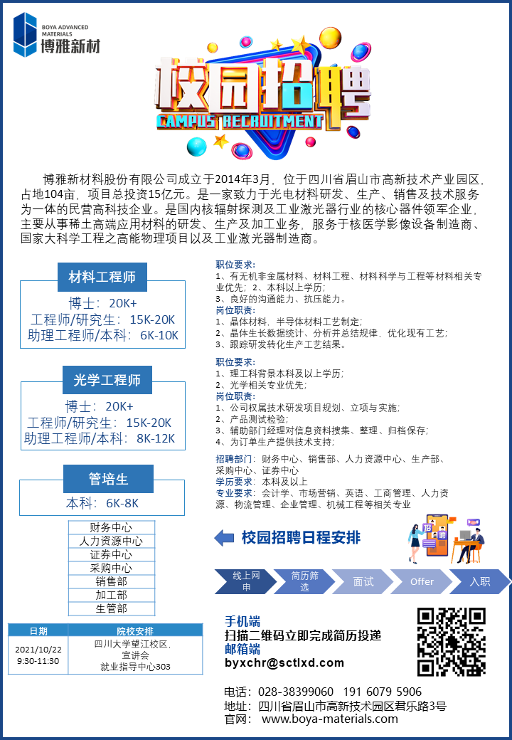 眉山博雅新材料有限公司是一家致力于光电材料研发,生产,销售及技术服务为一体的民营高科技公司,10月22日上午9:30到11:30在望江校区就业指导中心303进行校园宣讲会,欢迎各位同学前来参加!