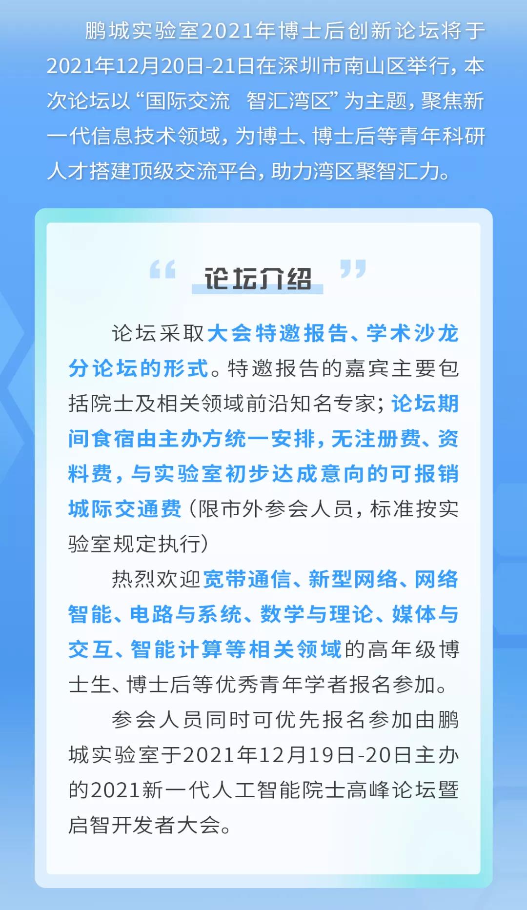 近期我们在筹划12月20-21日在深圳由实验室举办的博士后论坛,论坛主要议程为学术分享交流、了解深圳、了解鹏城实验室,报名成功的高年级博士生,我们会报销相关费用。