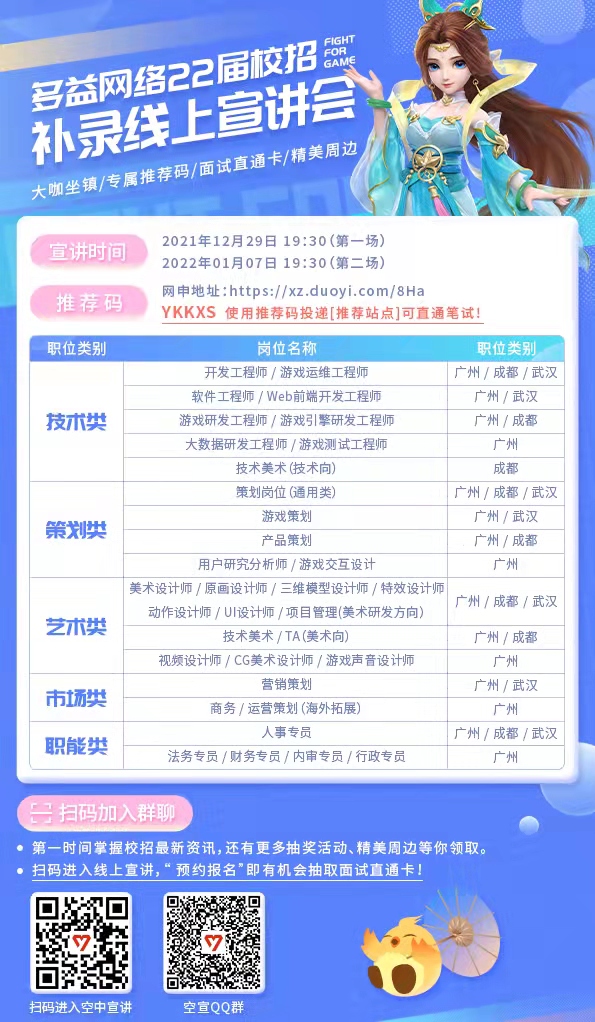 中国十大游戏研发商&运营商之一、中国互联网百强企业「多益网络」补录专场线上宣讲会重磅来袭!