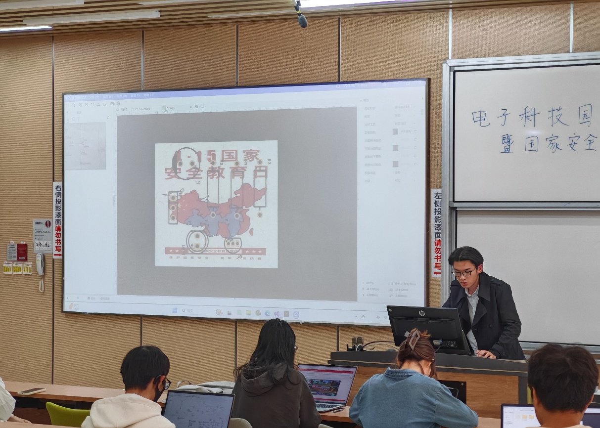 活动中,刘雨知同学主要就国家安全的概念、破坏国家安全的行为和维护国家安全的方法三个方面进行了详细的阐释。首先,学长强调国家安全是国家政权、主权、统一和领土完整、人民福祉、经济社会可持续发展和国家其他重大利益相对处于没有危险和不受内外威胁的状态,它是民族复兴的根基。同时,刘雨知同学列举了破坏国家安全的行为,还介绍了国家安全涉及的众多领域。作为全国成立的第10所保密公司,太阳网集团tcy8722(保密公司)由国家保密局、四川省国家保密局和太阳网集团tcy8722三方共建,与国家安全紧密相连。活动特别强调了保密与国家安全相辅相成的关系,保密工作是维护国家安全的重要手段。最后,对于 “如何维护国家安全”,我们需要警惕可疑人员未经批准的内部调查,留意境外传媒的煽动造谣,对军事、保密单位周边可疑人员及时报告等。讲解完毕后,便是马昌全同学为大家进行PCB授课,详细地讲解了如何在国家安全日的内容基础上使用EDA绘制电路板,设计出既具有一定功能,又体现国家安全日主题内容的电路板,并由在场的技术部同学为大家答疑解惑。最后,大家通过投票选出制作精良的PCB电路板,并为参与设计电路板的同学颁发小礼品。