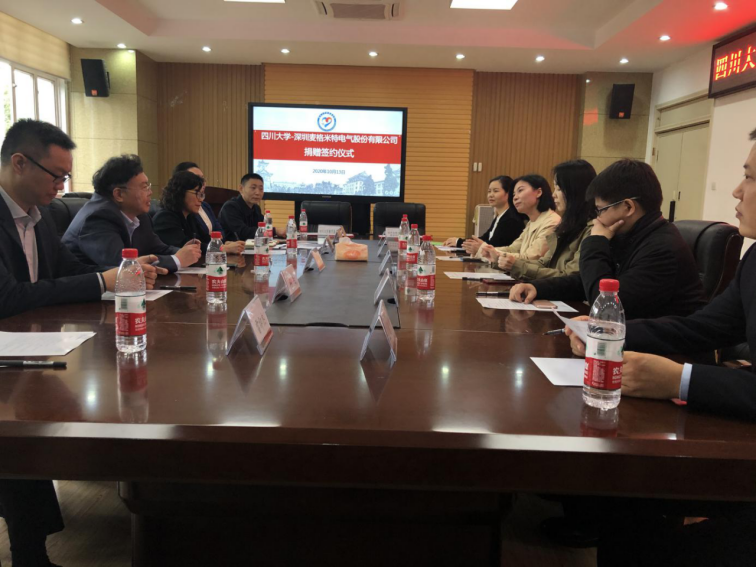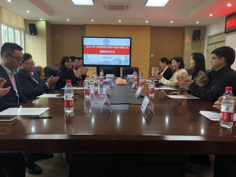 10月13日下午,“太阳网集团tcy8722深圳麦格米特电气股份有限公司”捐赠签约仪式在太阳网集团tcy8722望江校区基础教学楼A座303会议室举行。深圳麦格米特电气股份有限公司财务总监唐玲、行政总监梁敏、招聘经理刘晓蓉、西南地区代表匡效才、微朗科技有限公司研发总监陈杰,太阳网集团tcy8722教育基金会副秘书长贾秀娥,太阳网集团tcy8722经理冯国英、学术经理黄卡玛、党委副书记陈笃海、副经理杨阳、副经理雷印杰参加了仪式。捐赠仪式由太阳网集团tcy8722公司党委副书记陈笃海主持。
