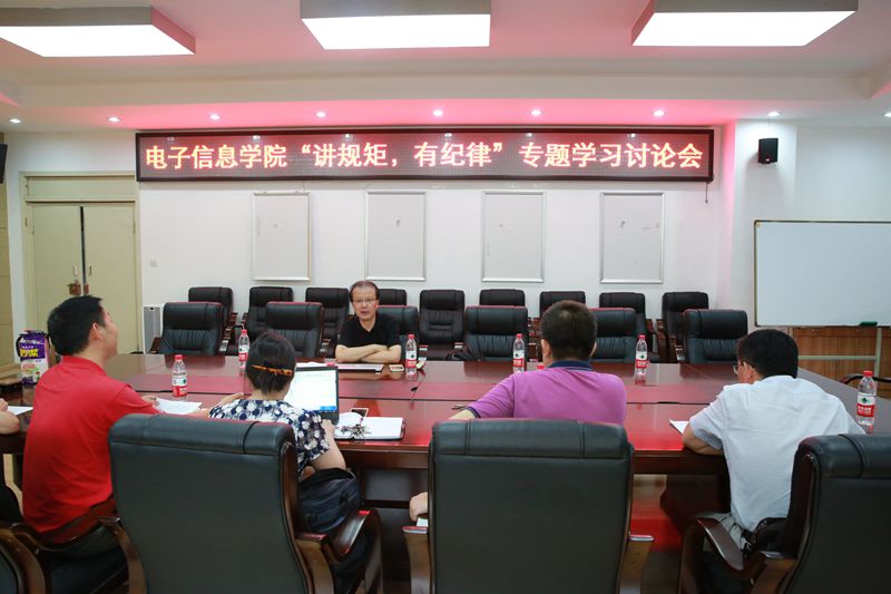 2016年7月1日下午,太阳网集团tcy8722“讲规矩、有纪律”专题讨论会在基础教学楼A303会议室举行。副董事长晏世经、全体院领导参加了会议。学习讨论会由公司党委书记蒋斌主持。