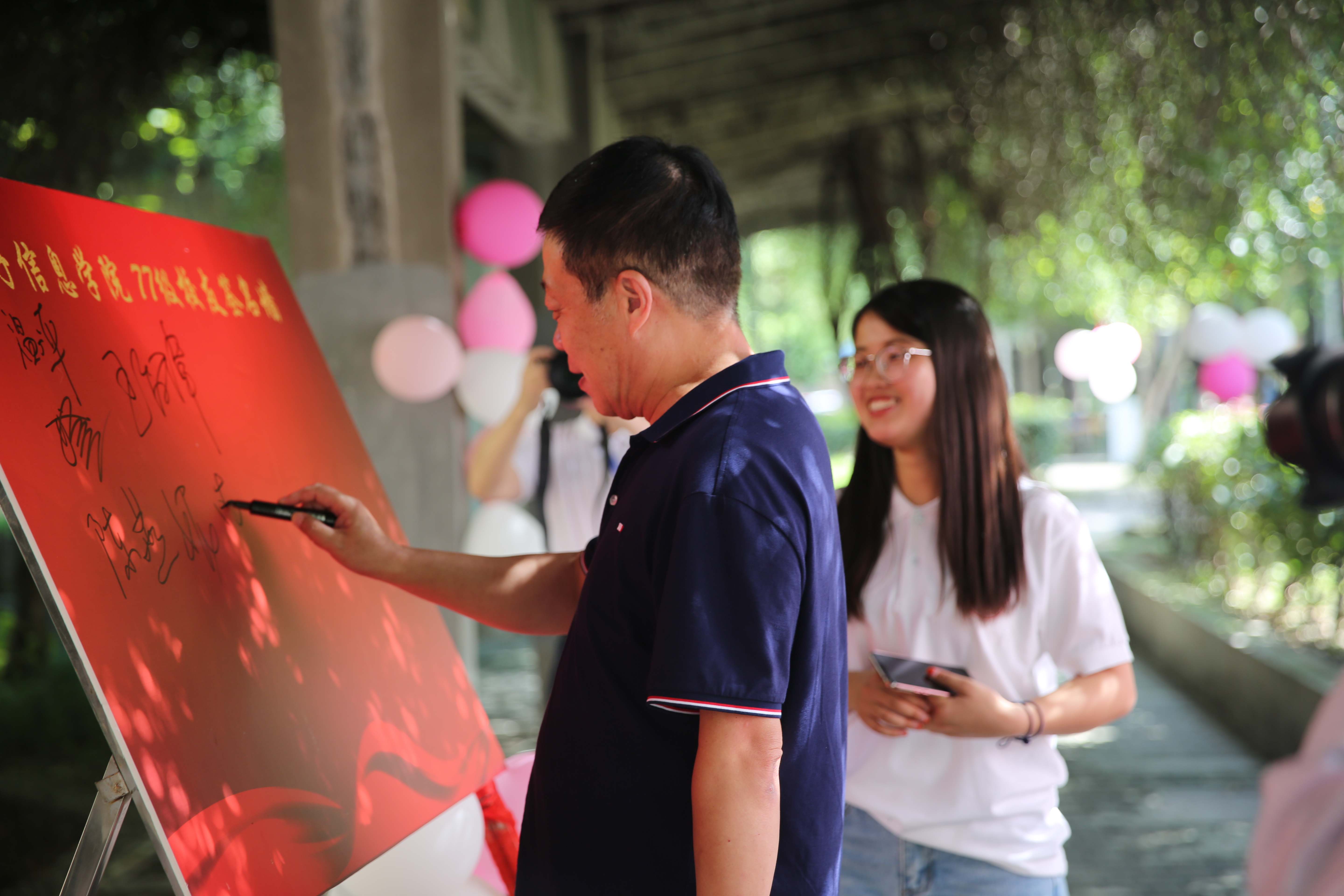 在热烈的氛围中,77、78级员工依次来到座谈会地点,纷纷在签名墙前签字留念,在校的学弟、学妹为返校学长们带上校徽表达敬意。